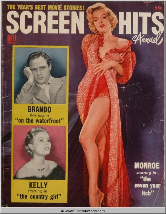 Color Transparency Slide of Marilyn Monroe who was featured as the Cover Girl on the cover of Screen Hits Magazine. Also featuring Marlon Brando and Grace Kelly on the cover. It is a transparency from a picture taken of the actual publication.