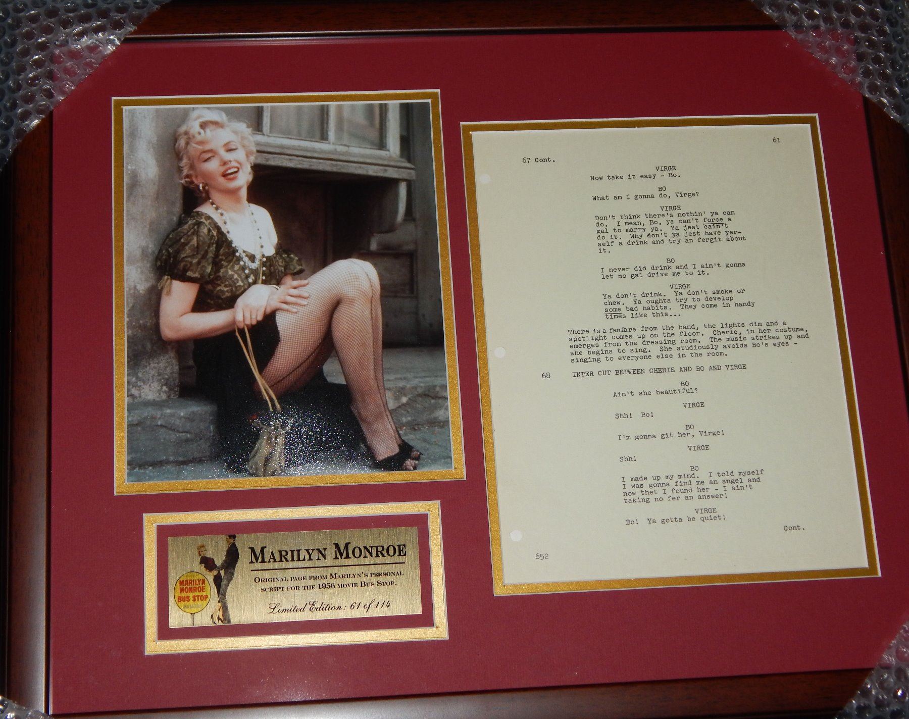 Limited edition framed original page from Marilyn Monroe's personal shooting script for the film Bus Stop. The script was purchased from a Christie's auction. All items come with a certificate of authenticity good for the life of the piece.