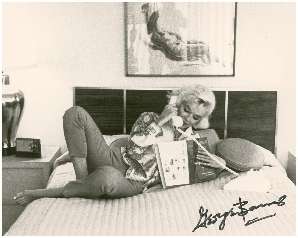 Satin-finish 10 x 8 Kodak print photograph of Marilyn Monroe casually laying on a bed and talking on the telephone, signed in black felt tip by Barris. This is an original 1987 print from the negative stamped on verso ‘Copyright 1987 George Barris, Marilyn Monroe/Weston Editions Ltd.’ In fine condition.