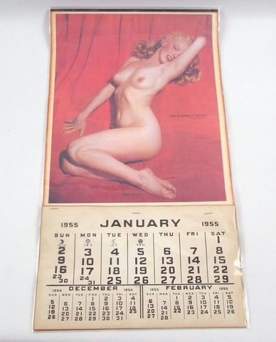 May 27th, 1949 is a day that will live in infamy. It is the day that a 22 year old blond named Marilyn Monroe walked into Tom Kelley's studio in Los Angeles, and created two of the most famous and iconic nudes in photographic history. Both show a staggeringly voluptuous Monroe completely naked against a sensuous red backdrop. The two photos were known as "Golden Dreams", and "A New Wrinkle". The images appeared in Playboy and on a series of calendars that would sell in the millions and to this day hold the record for the most calendars ever sold. They were also used on a plethora of other items from coasters to playing cards to bed sheets. This is an original actual wall-hanging Golden Dreams Calendar from 1955. It shows normal signs of patina caused by age, and some fading. 12"x21.5".