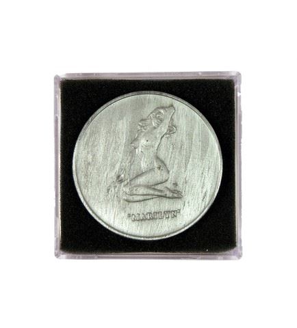 Marilyn Monroe Golden Dreams Calendar 1975 Solid Pewter Paperweight - Very Rare - Marilyn in Her famous Pose on Front And a 1975 Calendar on Rear of Coin. (approx. 2 1/2" diameter)