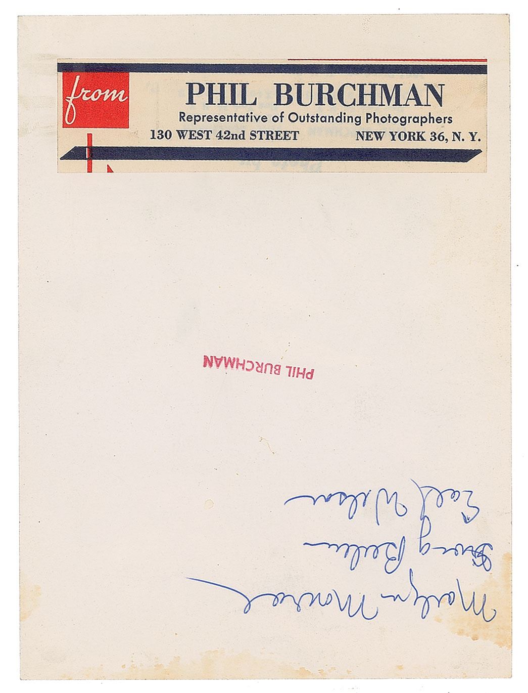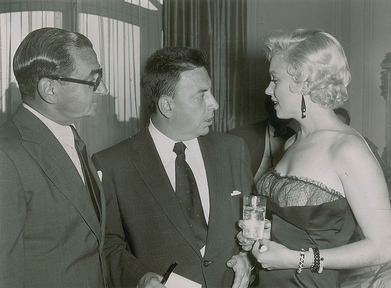 Original vintage glossy 8.5 x 6.5 silver gelatin photo of Marilyn Monroe, composer Irving Berlin, and columnist Earl Wilson having drinks. Reverse bears a Phil Burchman credit label. In fine condition, with light rippling from the label on the reverse.