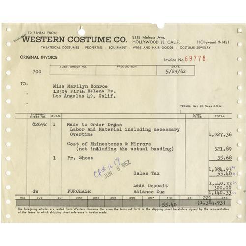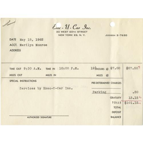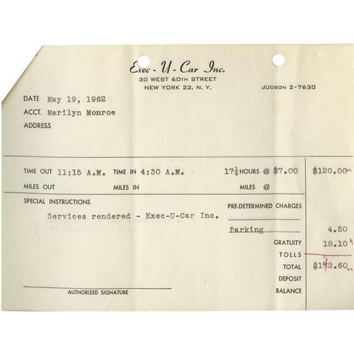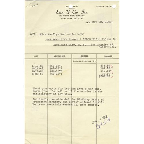<B>Documents Relating Directly to Marilyn Monroe's Performance for JFK's Birthday.</B></I> Offered are five original documents relating to Marilyn Monroe's performance at President Kennedy's 45th birthday tribute in Madison Square Garden on May 19, 1962, during which she sang "Happy Birthday Mr. President." Included in the lot is the original invoice for "the dress" she wore that night, later sold by Christie's for over $1.26 million.<BR><BR>At the JFK birthday tribute, Marilyn Monroe was introduced by actor Peter Lawford, Kennedy's brother-in-law. In front of more than 15,000 people, wearing the flesh-colored dress adorned with 2,500 rhinestones (which she literally had to be sewn into once she had dressed) Monroe's sultry rendition of "Happy Birthday" caused the President to comment "I can now retire from politics after having had Happy Birthday sung to me in such a sweet, wholesome way." The partly printed invoice for the dress is from Western Costume Co. in Hollywood, CA. Dated May 29, 1962 (JFK's birthday), it measures 8.5" x 7". The "Original Invoice" to "Miss Marilyn Monroe /12305 Fifth Helena Dr./Los Angeles 49, Calif." for "Made to Order Dress/Labor and Material including necessary Overtime" lists its amount as $1,027.36. Additionally, there are charges for rhinestones and mirrors ($321.89) and a pair of shoes ($35.68).<BR><BR>Other items offered are four partly printed statements from Exec-U-Car Inc. in New York City, the car service used by Marilyn in New York. Included is the receipt for the day of Monroe's "Happy Birthday" performance on which the time out was 11:15 a.m and the time in was 4:30 a.m. (she didn't go directly home after the event). On receipt dated May 22, 1962 has a typewritten note at the bottom: "Thank you again for letting Exec-U-Care Inc. serve you. Do tell us if the service is not satisfactory at any time.Incidently, we attended the Birthday Party of President Kennedy, and surely enjoyed it all. You were certainly wonderful, Miss Monroe." The remaining receipts are dated May 18th and May 20th. All items are in Fine condition. <I>Accompanied by a COA from John Reznikoff, PSA/DNA.</B></I><BR><BR><b>Shipping:</b> Flat Material, Small (<a target="_blank" href="http://www.heritageauctions.com/common/shipping.php">view shipping information</a>)
