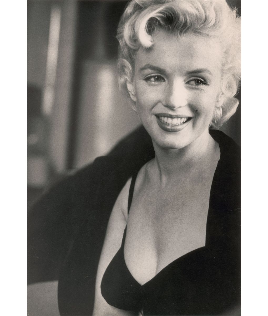 Rare original vintage 1961 silver gelatin double-weight photo of Monroe, dressed in a black top and jacket, taken at the Plaza by Jacques Lowe, and trimmed to a size of 9 x 13.5. Reverse bears a Lowe photographer’s stamp. In fine condition, with tape remnants to reverse and a few scattered light creases.