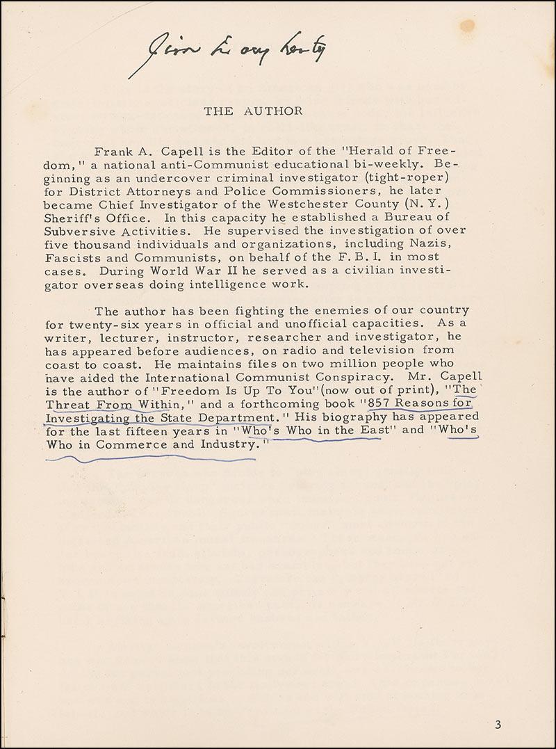 American author and police officer (1921-2005) who is best known for being the first husband of Marilyn Monroe. Signed book: The Strange Death of Marilyn Monroe by Frank A. Capell. Published by The Herald of Freedom, copyright 1964. Softcover, 7 x 9.5. Signed in black felt tip on the author biography page, “Jim Dougherty.” In very good condition, with mild staining, previous ownership sticker to title page, several sentences underlined, and soiling to the covers.