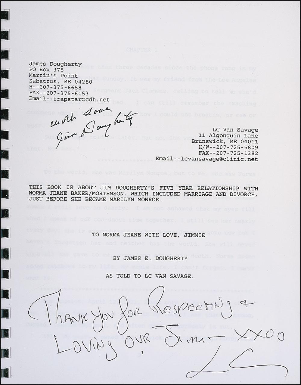 American author and police officer (1921-2005) who is best known for being the first husband of Marilyn Monroe. Dougherty’s spiral bound personal copy of his book entitled “To Norma Jeane with Love, Jimmie,” by Dougherty as told to LC Van Savage, 9.5 x 11, 176 pages, signed on the front page in black ink, “With love, Jim Dougherty,” and also signed, “Thank you for respecting & loving our Jim—xxoo, LC.” In fine condition.