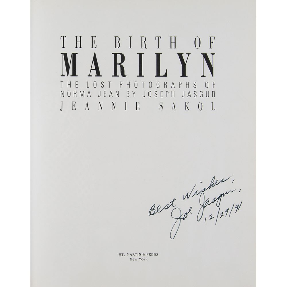 Signed book: The Birth of Marilyn: The Lost Photographs of Norma Jean by Joseph Jasgur. First edition. NY: St. Martin's Press, 1991. Hardcover with dust jacket, 10 x 12.5. Signed on the title page in black felt tip, "Joe Jasgur, 12/29/91." In fine condition.