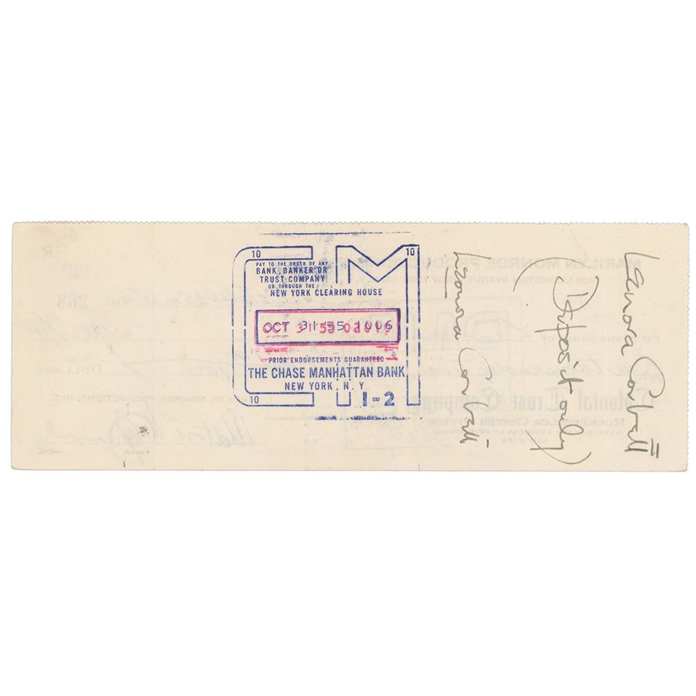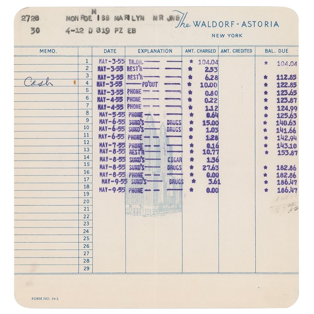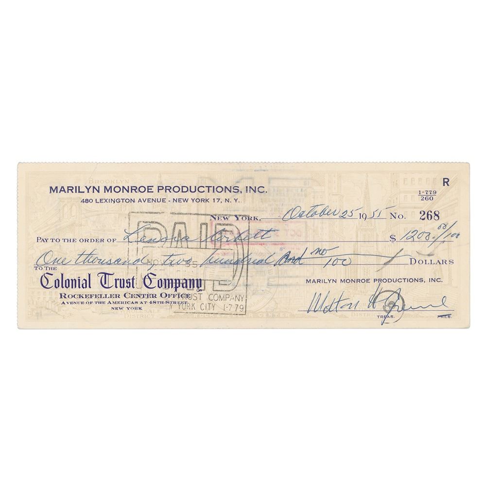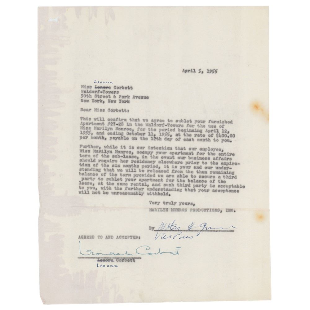 Three rare one-of-a-kind items pertaining to Monroe's lease of actress Leonora Corbett's apartment at the Waldorf Astoria in New York City: a document sent to Leonora Corbett by Milton Greene, signed by both parties, one page, 8.5 x 11, April 5, 1955, in part: "This will confirm that we agree to sublet your furnished Apartment #27-28 in the Waldorf-Towers for the use of Miss Marilyn Monroe"; a Marilyn Monroe Productions, Inc. check made payable to Leonora Corbett for $1200, October 25, 1955, signed by Milton Greene and endorsed twice on the reverse by Corbett; and a Waldorf-Astoria invoice for purchases made by Monroe during May 1955, listing phone, sundries, and restaurant charges associated with Monroe’s suite. In overall very good to fine condition.