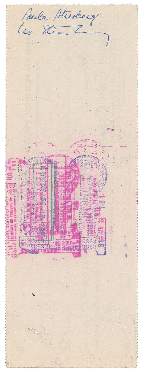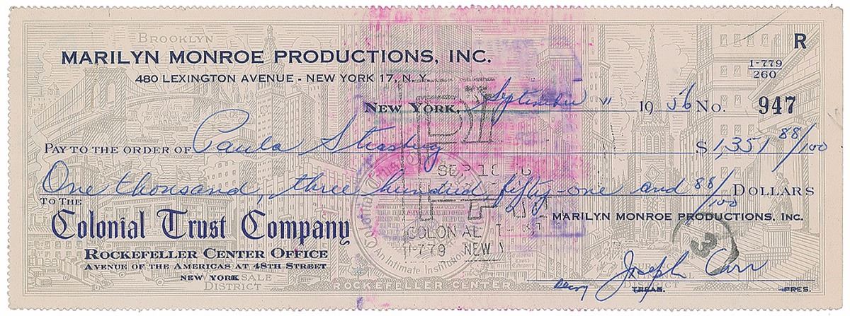 Marilyn Monroe Productions business check, 8.25 x 3, filled out in another hand and signed by board director Joseph Carr, payable to Paula Strasberg for $1351.88, September 11, 1956, and endorsed on the reverse in blue ballpoint by both Paula and Lee Strasberg. In fine condition.