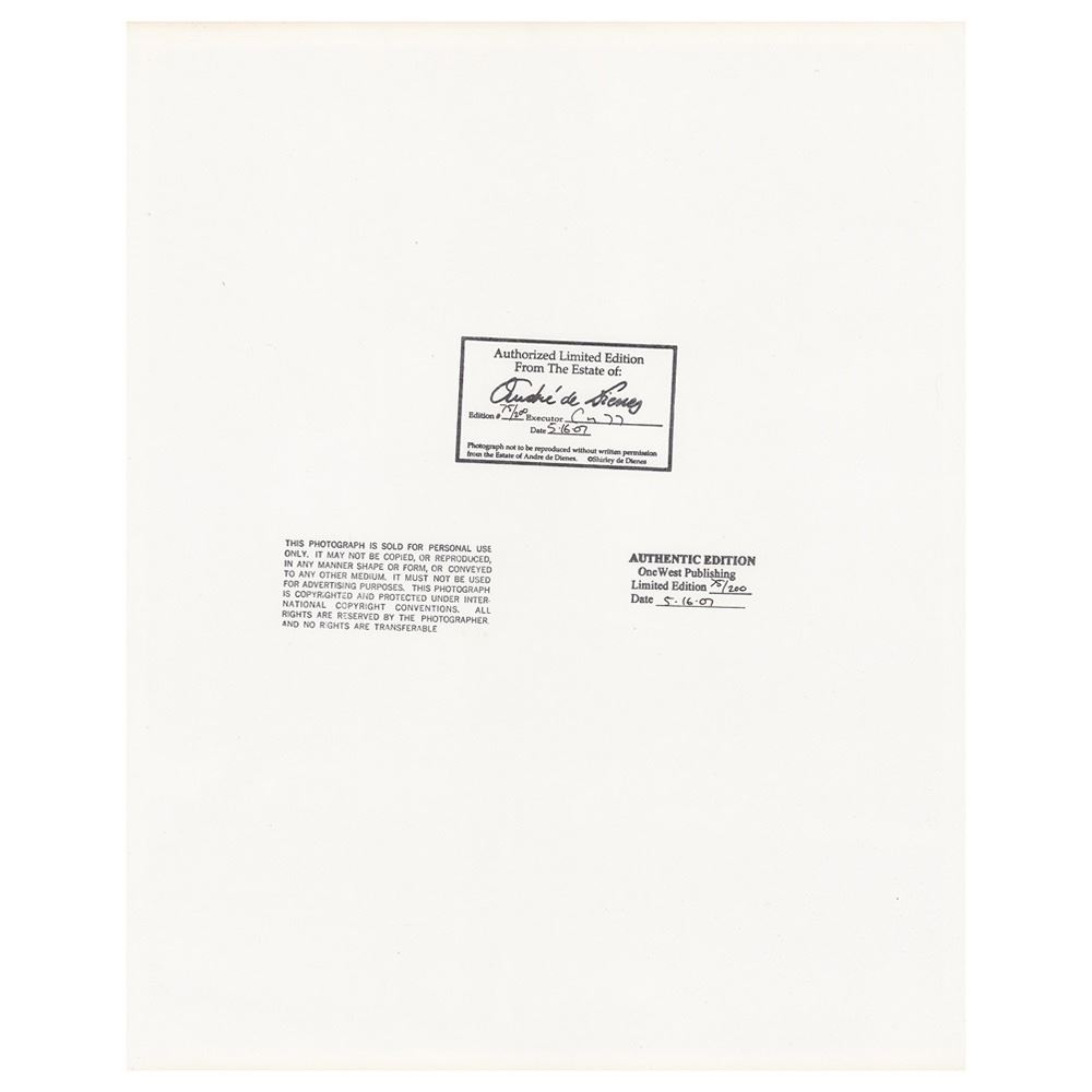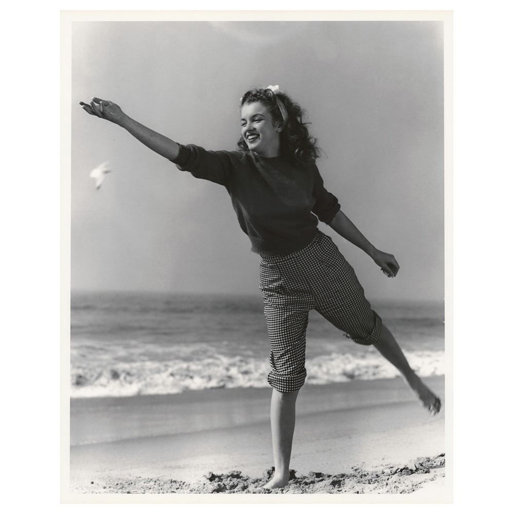 Huge limited edition matte-finish 16 x 20 silver gelatin print of Monroe on the beach in a full-length pose by Andre de Dienes, numbered 75/250. Reverse bears 2007 OneWest Publishing/Andre de Dienes Estate stamps. In fine condition.