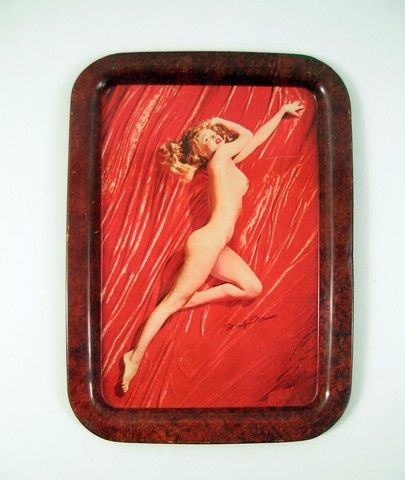 This is the famous "A New Wrinkle" full size serving tray, based on Tom Kelly's famous photo of Marilyn Monroe. These trays were pressed out in pairs. The sister tray is the other Tom Kelley famous nude image called "Golden Dreams". This is an original tray created during the first run in the 1950's. Marilyn Monroe's "Signature" is printed on the lower right side. In Excellent condition. 12.5"x17.5".