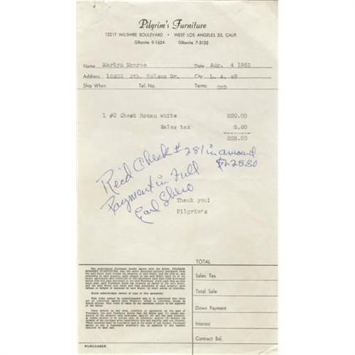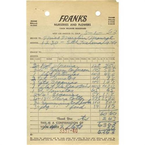 <B>Marilyn Monroe Original Carbon Invoice and Bill.</B></I> Marilyn Monroe's death was ruled a "probable suicide" by Los Angles County Coroner Thomas Noguchi. Would someone who had just purchased flowers, flowerpots, and bird food for her garden and had furniture delivered literally hours before her death commit suicide? You decide! Offered are two items. First, the original carbon invoice from Frank's Nurseries and Flowers (ordered three days before her death). The partly printed carbon bill measures 5" x 7.75" and lists petunias, tomatoes, terra-cotta pots, hummingbird feeders, and hummingbird food. The carbon has staple holes and two files holes in the upper blank area. Next, a partly printed bill on Pilgrim's Furniture letterhead to Marilyn Monroe dated August 4, 1962. The bill measures 6" x 10.5" and is for "1 #C Chest Roman White" for $228.80, "COD," noted in ink "Rec'd check #281 in amount $228.80 Payment in Full Earl Shero." That evening, Marilyn retired to her bedroom at about 8:00 pm and was found dead in her bed eight hours later. The Pilgrim's Furniture bill has a small hole in the upper left corner. Both items are in fine condition. <I>Accompanied by a COA from John Reznikoff, PSA/DNA.</B></I><BR><BR><b>Shipping:</b> Flat Material, Small (<a target="_blank" href="http://www.heritageauctions.com/common/shipping.php">view shipping information</a>)