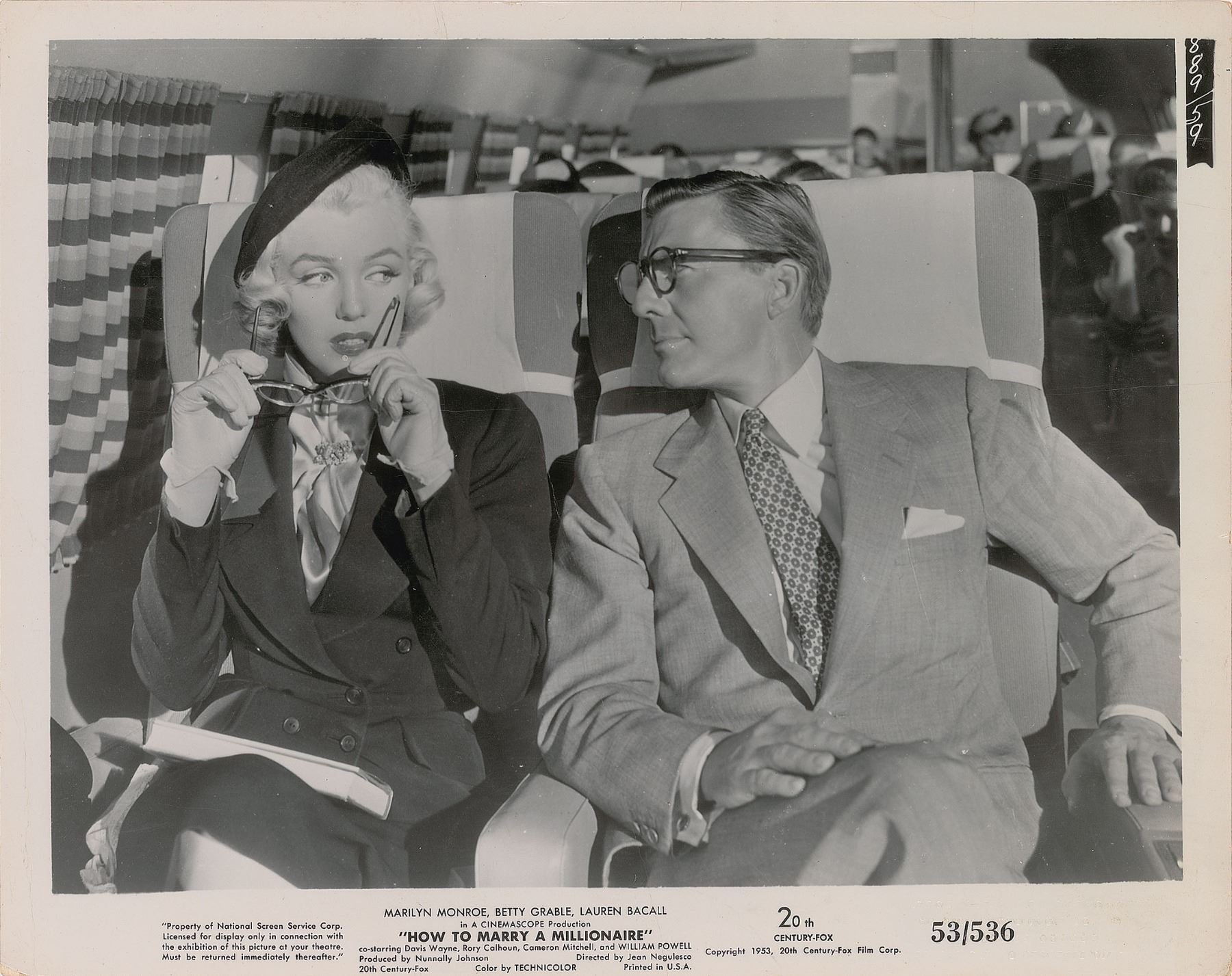 Original vintage glossy 10 x 8 20th Century-Fox publicity photo for How to Marry a Millionaire, showing Marilyn Monroe as Pola Debevoise and David Wayne as Freddie Denmark. Blindstamped in the lower corner with licensing information; reverse is stamped-dated September 12, 1953. In very good to fine condition, with light creasing, and a heavier diagonal creases passing between Wayne and Monroe.