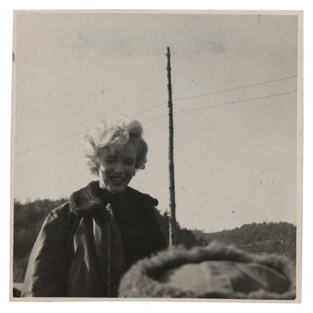 Original vintage glossy 3 x 3 candid snapshot photograph of Marilyn Monroe during her famous visit to entertain the American soldiers in Korea in February 1954. In fine condition. Consignor notes that this is an unpublished photo from the day she visited the 2nd Infantry Division. Monroe performed in 10 shows over four days before a total audience of 100,000 soldiers.