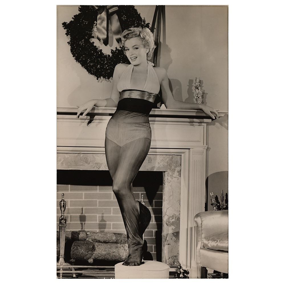 Original vintage glossy 6.5 x 10.5 silver gelatin photo of Marilyn Monroe in a marvelous full-length pose in front of a fireplace with decorative holiday wreath. In very good to fine condition, with trimmed edges, and scattered light creasing.