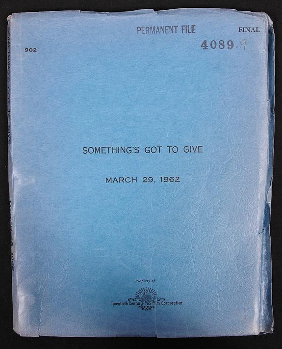 [Marilyn Monroe] Original Script For "Something's Got To Give". Beautifully preserved final draft 149-page original script for "Something's Got To Give," 11½ x 9", March 29, 1962, housed in the original 20th Century Fox folder. This was Marilyn's last film. Filming started April 23, 1962, only to be abandoned when she died unexpectedly in August. The film was eventually released in 1963 as "Move Over" with Doris Day replacing Monroe and James Garner replacing Monroe's co-star, Dean Martin, who refused to finish the film without her. A grand Marilyn collectible.