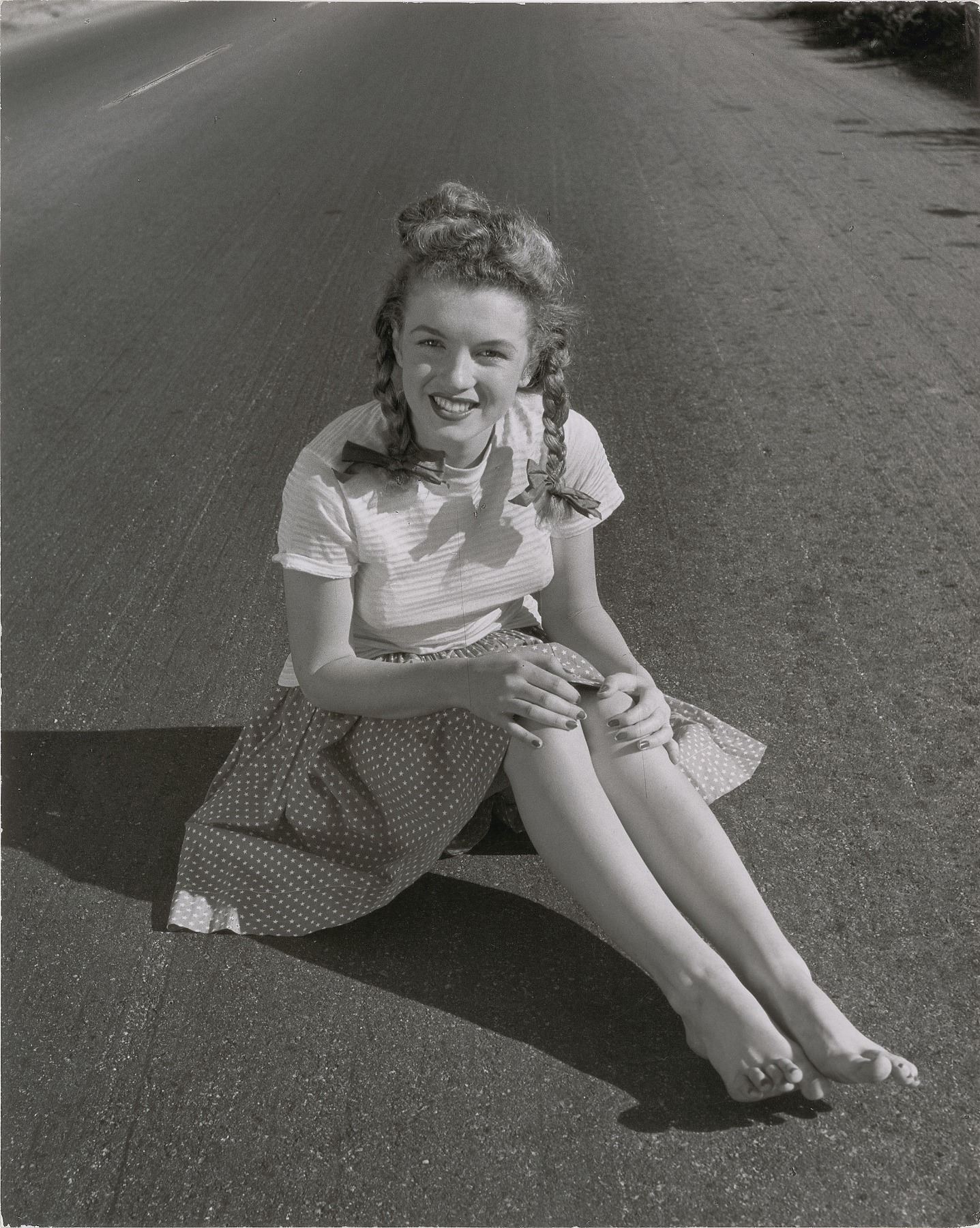 Striking original oversized glossy 10.75 x 13.5 silver gelatin photo of the young Monroe sitting on the road and wearing a star-patterned skirt, taken by Andre de Dienes in 1945. Reverse bears Andre de Dienes credit stamps. In fine condition. From the Globe Photo archives.