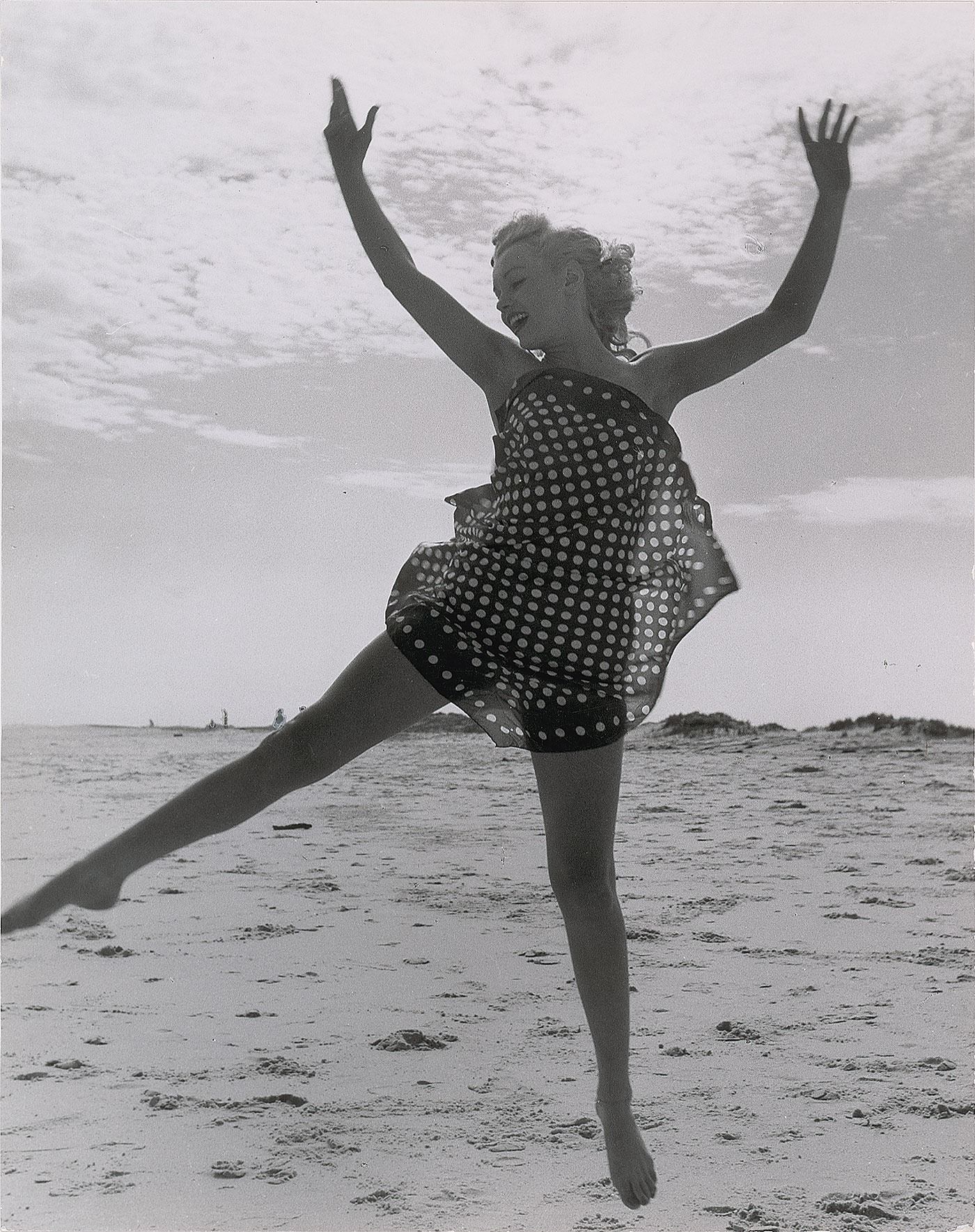 Marvelous original oversized glossy 10.25 x 13 silver gelatin photo of Monroe leaping on a beach, taken by Andre de Dienes in 1949. Reverse bears Andre de Dienes credit stamps. In fine condition, with some light crazing to the emulsion. From the Globe Photo archives.