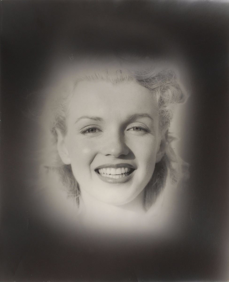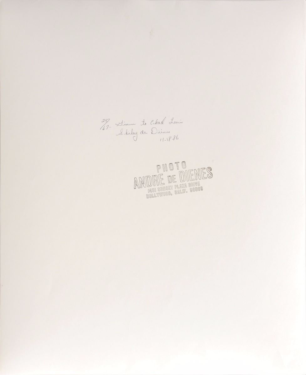 Vintage matte-finish 16 x 20 gelatin silver close-up portrait of an ebullient Monroe. Reverse bears an Andre de Dienes photography stamp, as well as an ownership notation by his wife, “25/67–Given to Chad Lewis, Shirley de Dienes, 11-18-86.” In fine condition. In 1945, de Dienes became the first photographer to shoot the young Norma Jeane as a professional model. His photos of Monroe appeared on over twenty-three magazine covers from 1945 to 1949 worldwide. Photos by de Dienes remain highly desirable.
