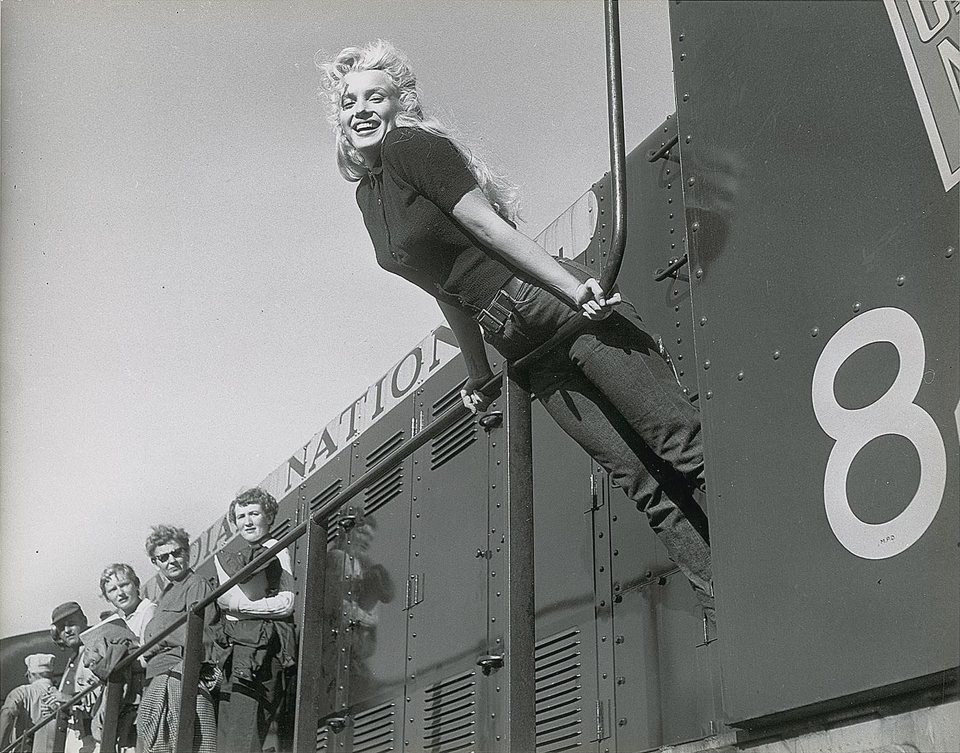 Satin-finish 14 x 11 photo of Monroe printed circa 1970s, showing her hanging off the side of a train. Reverse bears "This paper manufactured by Kodak" watermarks and a "Silver Screen" ink stamp. In fine condition.