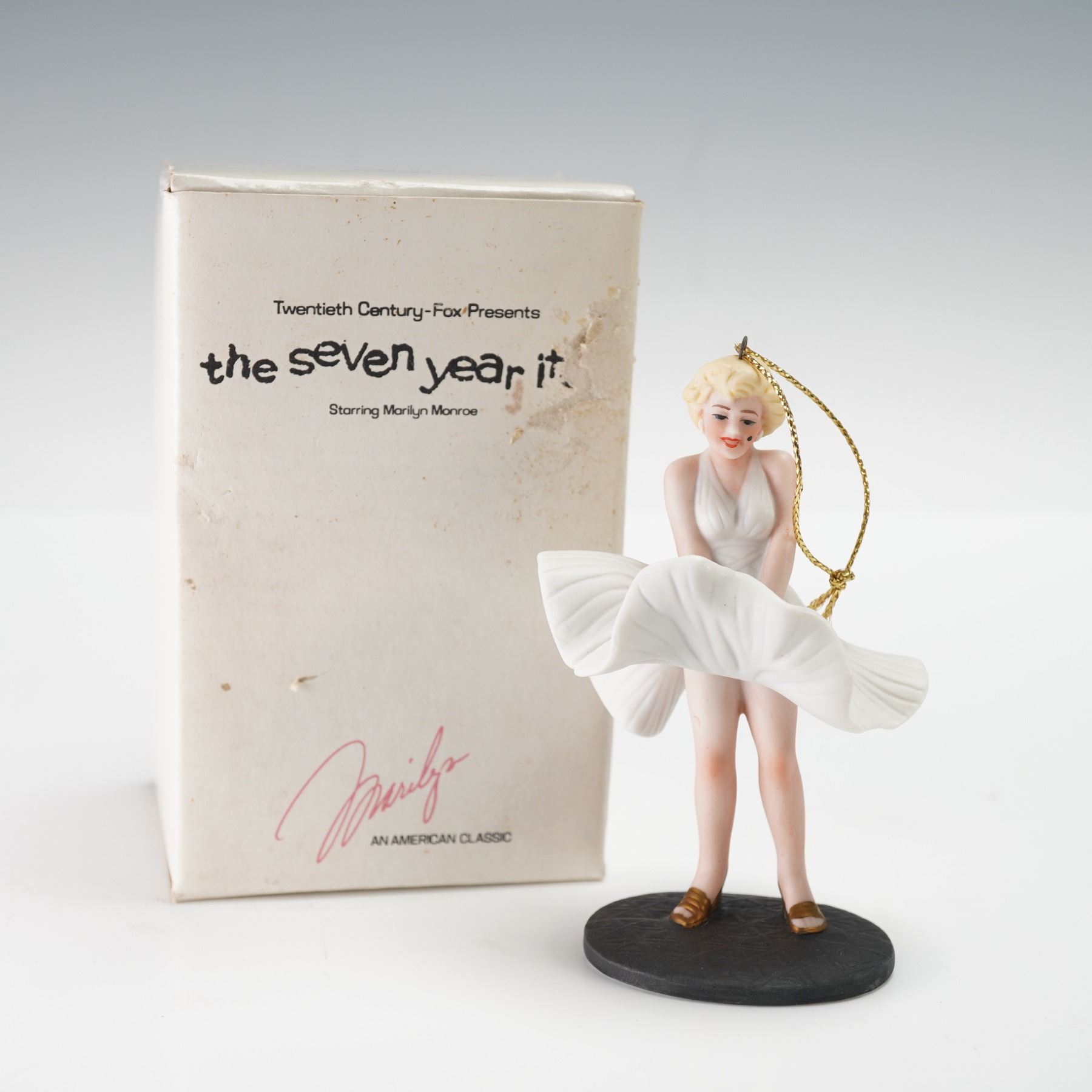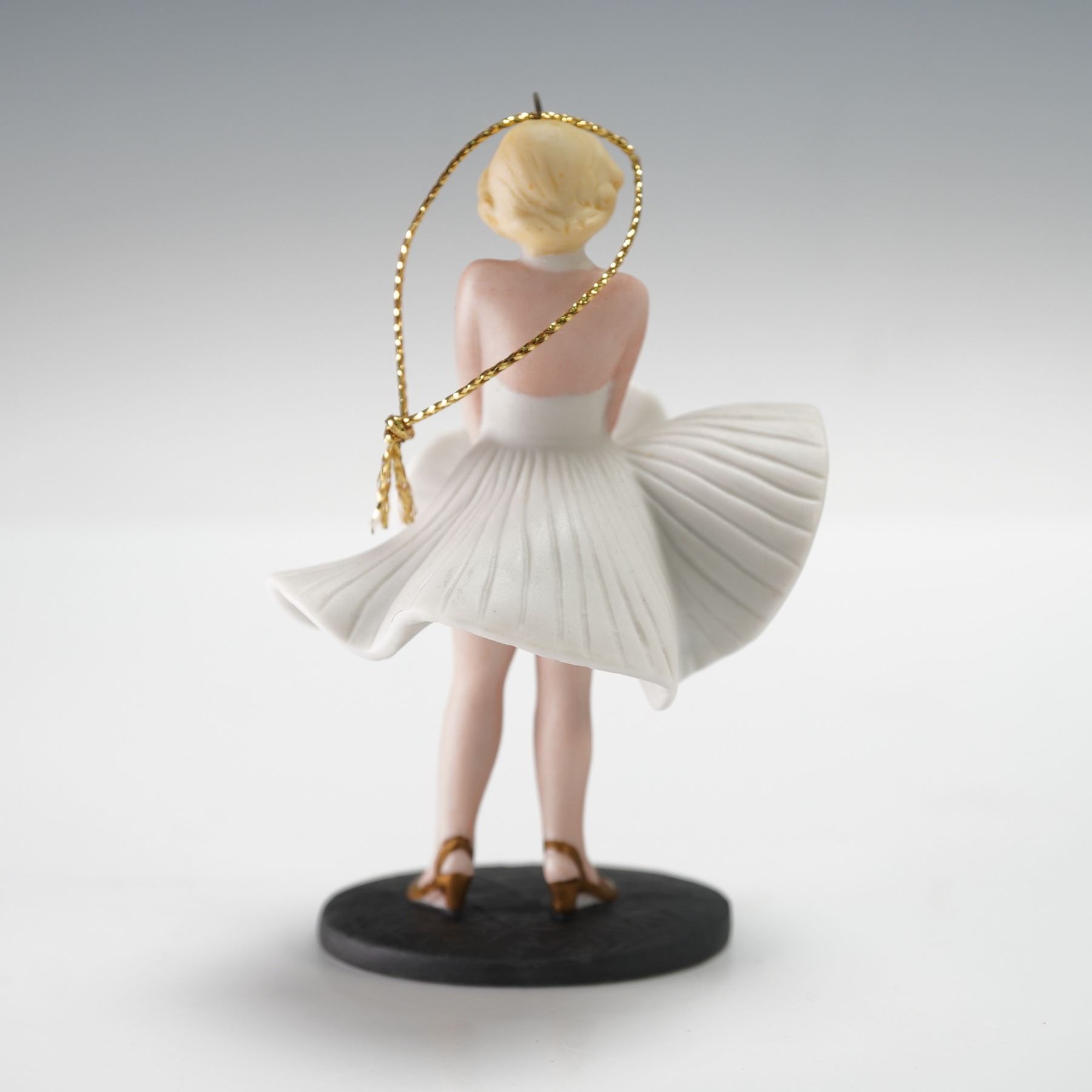 This charming porcelain ornament features Marilyn Monroe in her iconic scene from The Seven Year Itch, where her white dress is playfully blown by a breeze. The ornament captures this timeless moment from the 1955 film, showcasing Monroe's grace and beauty. This item has its original box. This item has its original box.