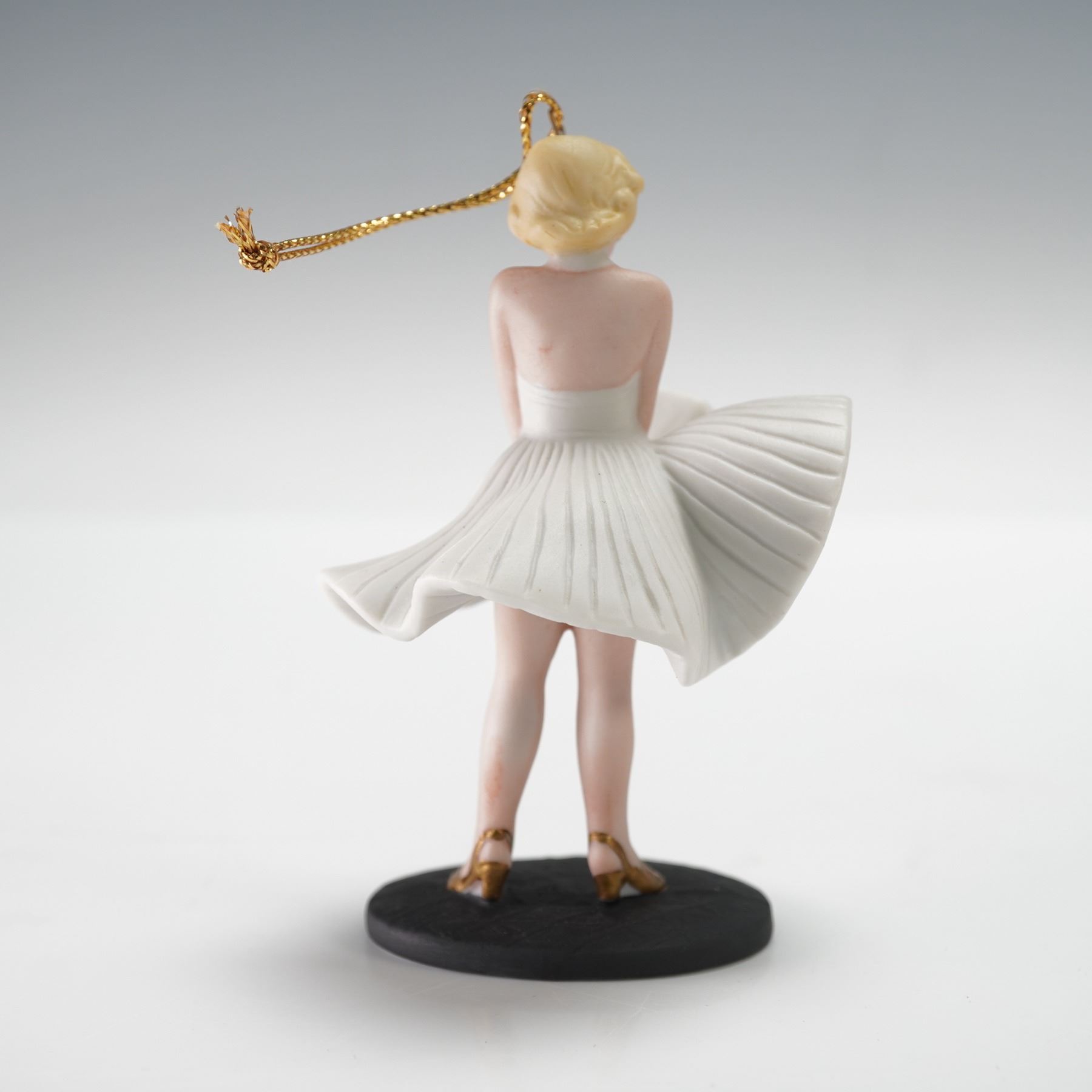This charming porcelain ornament features Marilyn Monroe in her iconic scene from The Seven Year Itch, where her white dress is playfully blown by a breeze. The ornament captures this timeless moment from the 1955 film, showcasing Monroe's grace and beauty. This item has its original box.