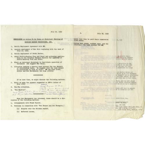 <B>Two Documents Related to Marilyn Monroe Productions.</B></I> Fascinating behind-the-scenes correspondence, with insight into the legal concerns of Monroe's production company. The first item is a copy of a typed letter to Warner Bros. Pictures, Inc., dated March 27, 1957, regarding concerns with the film <I>The Prince and the Showgirl</B></I> and notes that "Marilyn Monroe is not the only stockholder and does not have the right as an individual or as president or as stockholder to change contracts of this corporation." The letter is from Milton H. Greene, Vice-President of Marilyn Monroe Productions, Inc. and is not signed. Attached is a postmarked envelope addressed to M.C.A. Artists, Ltd, which received a copy of this letter. The second item is a memorandum dated July 29, 1959, regarding "Action To Be Taken at Directors' Meeting of MARILYN MONROE PRODUCTIONS, INC." The two-page agenda includes "Ratify Employment Agreement with MM" and "Problems in connection with <I>The Prince and the Showgirl</B></I>." The agenda has some annotation and financial figures added in pen. In Very Fine condition. <I>Accompanied by a COA from John Reznikoff, PSA/DNA.</B></I><BR><BR><b>Shipping:</b> Flat Material, Small (<a target="_blank" href="http://www.heritageauctions.com/common/shipping.php">view shipping information</a>)