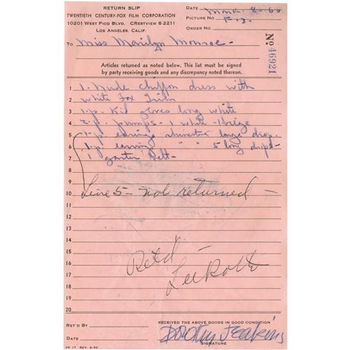 <B>Marilyn Monroe Receipt for Costume and Jewelry.</B></I> Pink Return Slip receipt no. 46921, 5.5" x 8.5", from 20th Century-Fox Studios, dated March 8, 1960, itemizing articles borrowed by "Miss Marilyn Monroe," including nude chiffon dress with white fox trim, one pair of kid gloves, long and white, two pair of pumps, one white, one beige, one pair of rhinestone earrings with large "drip", one pair of rhinestone earrings with five long "drips," one garter belt. There is a notation that the rhinestone earrings with one large drip were "not returned." Several lines down the word "Ret'd" is noted, and the carbon receipt has the signature of studio wardrobe clerk Dorothy Jeakins. This receipt comes from the time of the production of <I>Let's Make Love</B></I> and is in Very Fine condition. <I>Accompanied by a COA from John Reznikoff, PSA/DNA.</B></I><BR><BR><b>Shipping:</b> Flat Material, Small (<a target="_blank" href="http://www.heritageauctions.com/common/shipping.php">view shipping information</a>)