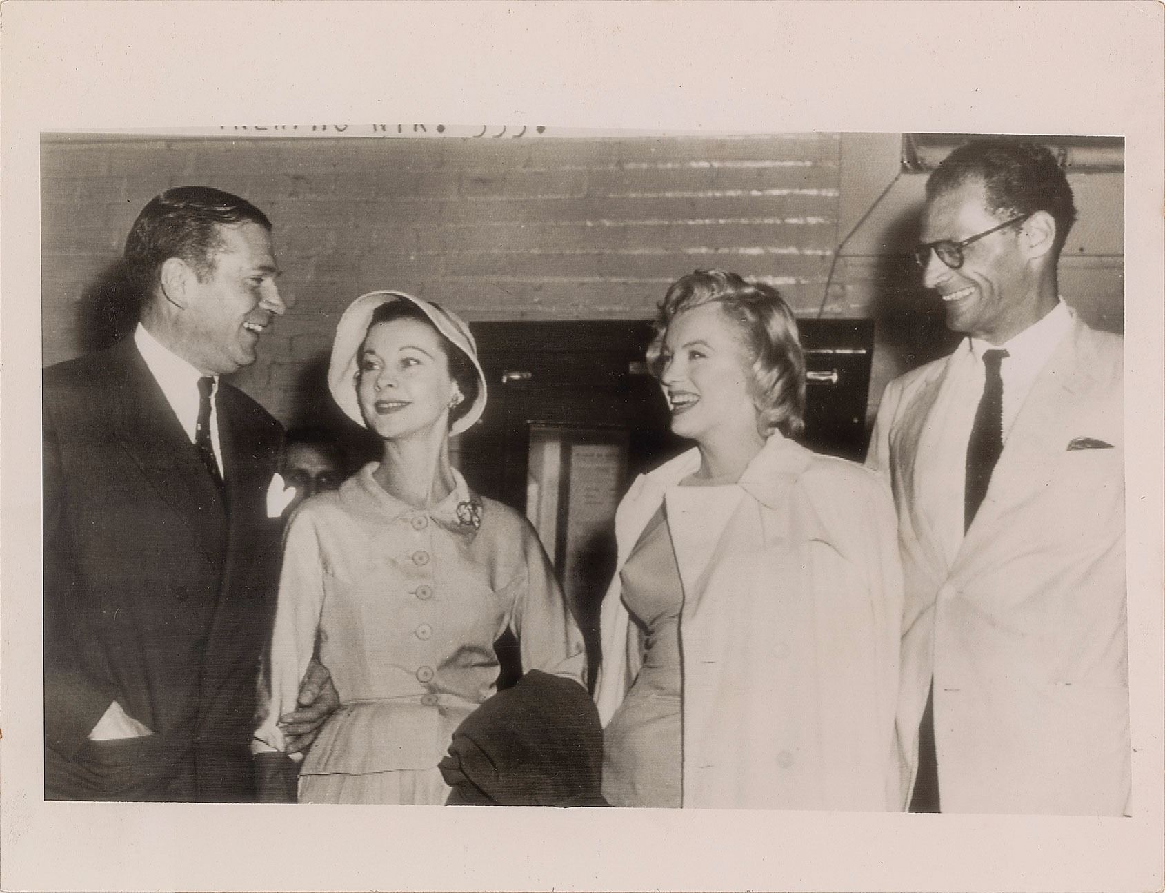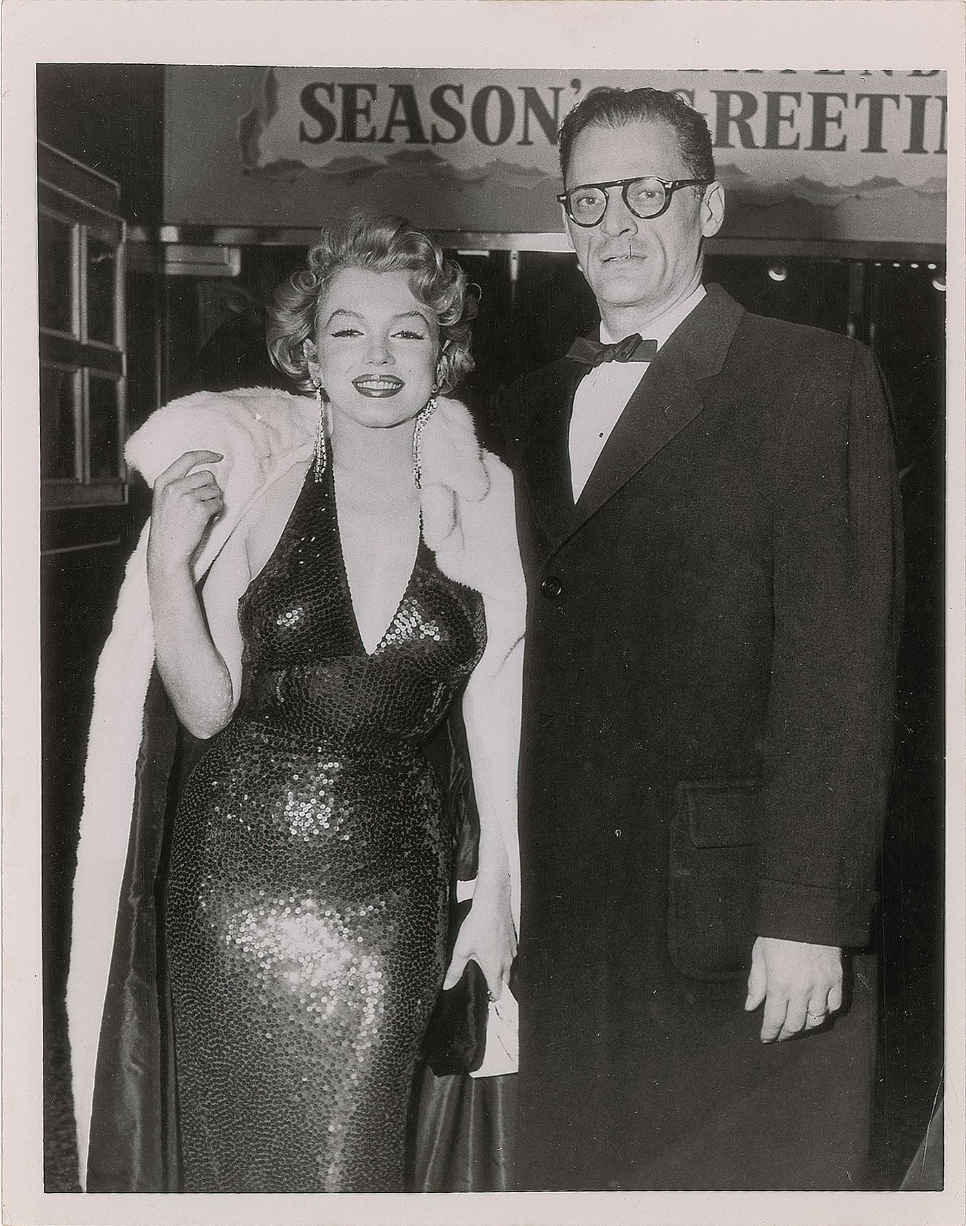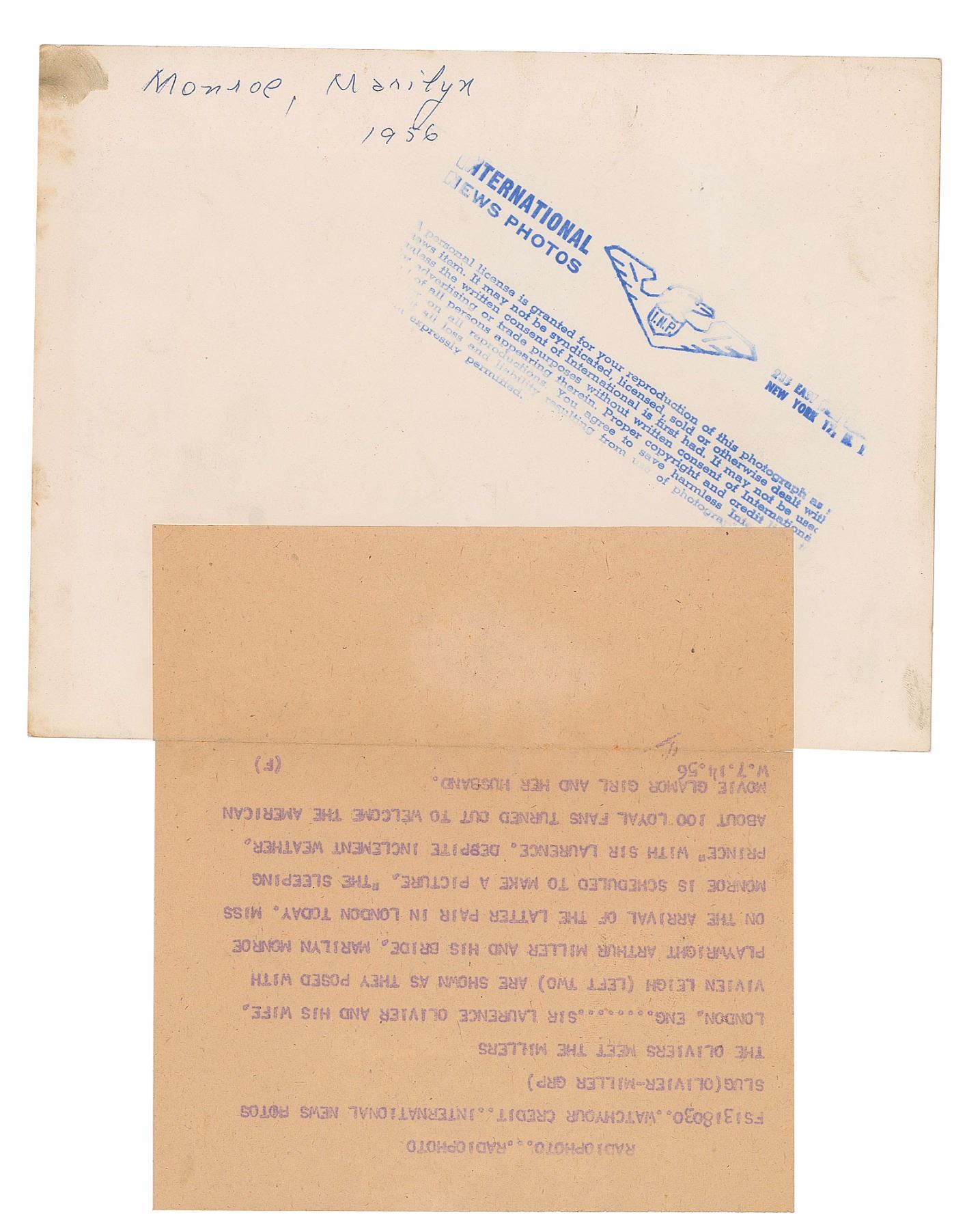 Three vintage glossy photos of Monroe, including: a 6 x 7 photo of Monroe getting dressed in The Prince and the Showgirl; a 9 x 7 press photo of Monroe and Arthur Miller meeting Laurence Olivier and Vivien Leigh in 1956, bearing an International News Photos credit stamp and affixed caption on the reverse; and a 7 x 9 press photo of Monroe and Miller together in 1956, bearing a United Press Association credit stamp and affixed caption on the reverse. In overall very good to fine condition, with scattered creasing and trimmed edges to the Prince and the Showgirl photo.