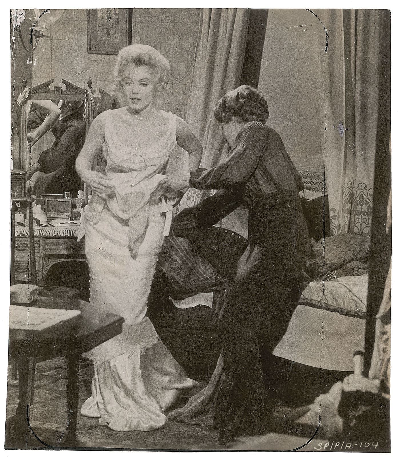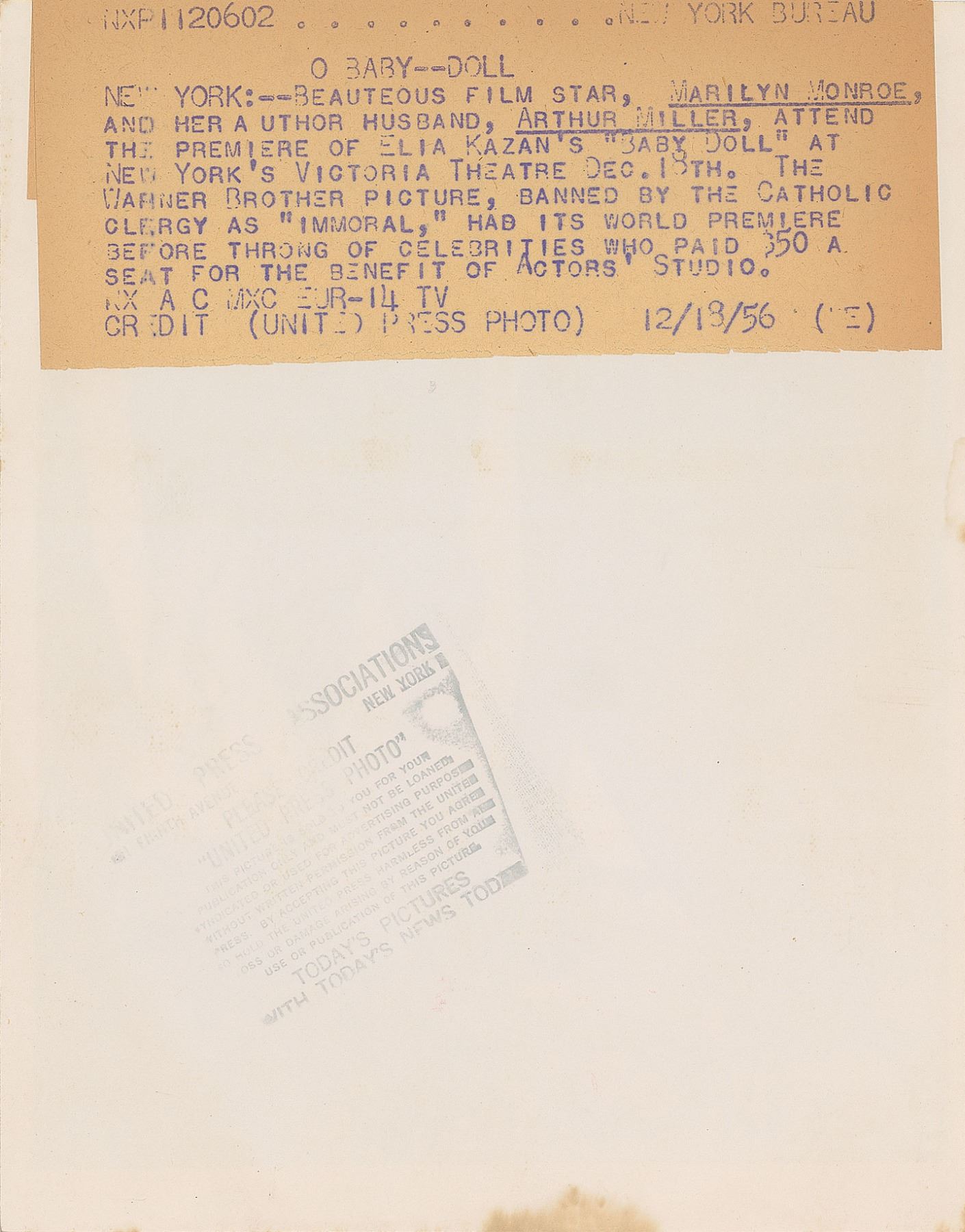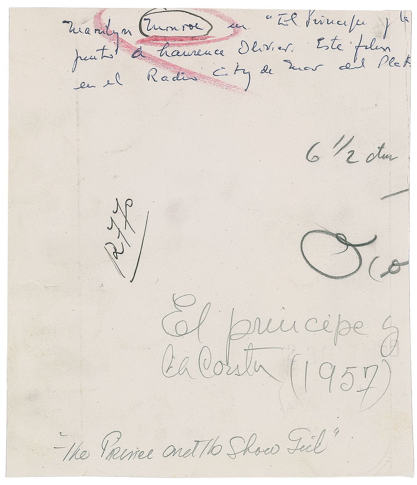 Three vintage glossy photos of Monroe, including: a 6 x 7 photo of Monroe getting dressed in The Prince and the Showgirl; a 9 x 7 press photo of Monroe and Arthur Miller meeting Laurence Olivier and Vivien Leigh in 1956, bearing an International News Photos credit stamp and affixed caption on the reverse; and a 7 x 9 press photo of Monroe and Miller together in 1956, bearing a United Press Association credit stamp and affixed caption on the reverse. In overall very good to fine condition, with scattered creasing and trimmed edges to the Prince and the Showgirl photo.