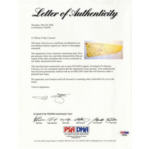 <B>Marilyn Monroe Signature Cut.</B></I> Approximately 5" x 2" cut with Monroe's signature in blue ink. In Very Fine condition with some mild tanning and wear. <I>Accompanied by a COA from PSA/DNA.</B></I><I>Accompanied by LOA from PSA/DNA.</B></I><BR><BR><b>Shipping:</b> Flat Material, Small (<a target="_blank" href="http://www.heritageauctions.com/common/shipping.php">view shipping information</a>) <BR><BR><B>Important notice:
