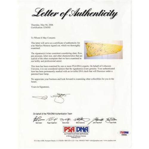 <B>Marilyn Monroe Signature Cut.</B></I> Approximately 5" x 2" cut with Monroe's signature in blue ink. In Very Fine condition with some mild tanning and wear. <I>Accompanied by a COA from PSA/DNA.</B></I> <I>Accompanied by LOA from PSA/DNA.</B></I><BR><BR><b>Shipping:</b> Flat Material, Small (<a target="_blank" href="http://www.heritageauctions.com/common/shipping.php">view shipping information</a>)