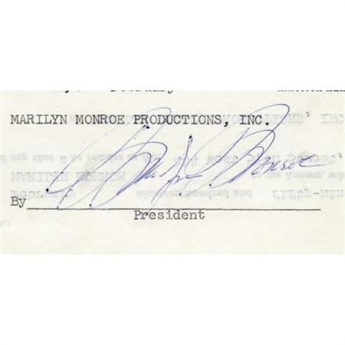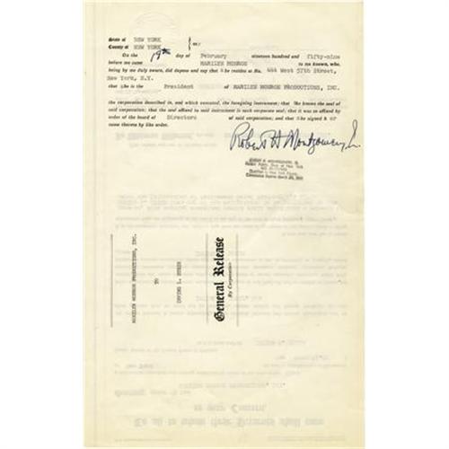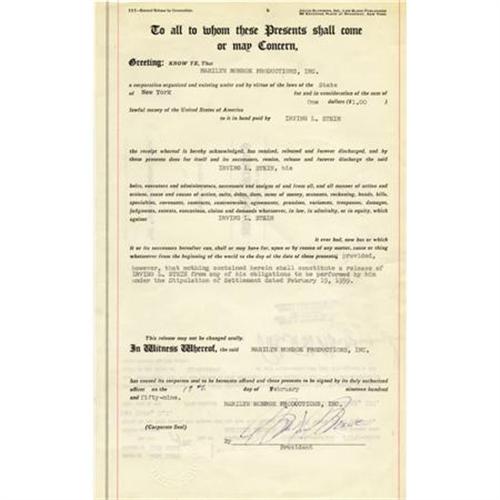 <B>Marilyn Monroe Signed Agreement.</B></I> A notarized general release agreement between Marilyn Monroe Productions, Inc. and Irving L. Stein, dated February 19, 1959 (shortly before the release of <I>Some Like It Hot</B></I>) and signed by the iconic actress in blue ink. In Excellent condition with mild overall toning. <I>Accompanied by LOA from PSA/DNA.</B></I><BR><BR><b>Shipping:</b> Flat Material, Small (<a target="_blank" href="http://www.heritageauctions.com/common/shipping.php">view shipping information</a>)