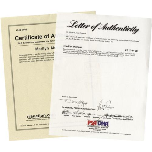 <B>Marilyn Monroe Signed Book Cover.</B></I> The front cover from a paperback edition of Henry Miller's <I>Nights of Love and Laughter,</B></I> elaborately signed on the reverse by Monroe in blue ballpoint. In Very Fine to Excellent condition with very minor corner creases and a rough right edge from being torn from the book. A gorgeous sample of her signature. <I>Accompanied by certificates of authenticity.</B></I><I>Accompanied by LOA from PSA/DNA.</B></I><BR><BR><b>Shipping:</b> Small Flat (<a target="_blank" href="http://www.heritageauctions.com/common/shipping.php">view shipping information</a>)