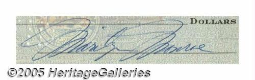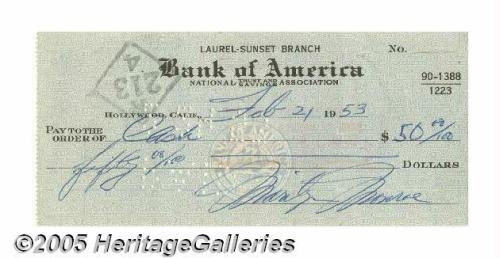 <B>Marilyn Monroe Signed Check.</B></I> Personal check for $50 cashed by Marilyn Monroe on February 21, 1953, signed by the actress in blue ink. In great condition with the usual cancellation holes and stamps. <I>With COA from PSA/DNA.</B></I>
