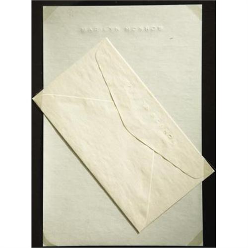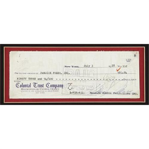 <B>Marilyn Monroe Signed Check With Blank Monroe Stationery.</B></I> Handwritten check from Colonial Trust Company, payed to the order of Pandick Press, Inc. for $93.94, dated July 3, 1958 and signed in blue ink over a typed "Marilyn Monroe Productions Inc." The check is framed with a lively 7.75" x 9.5" portrait of a laughing Marilyn Monroe, together with a blank sheet of stationery and matching envelope, both embossed with her name. In Very Fine condition. <I>Accompanied by a COA from PSA/DNA.</B></I><B>Condition Report:</B> In Very Fine condition.<BR><BR><b>Shipping:</b> Framed - with Glass, Medium (<a target="_blank" href="http://www.heritageauctions.com/common/shipping.php">view shipping information</a>)