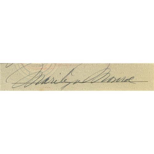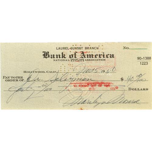 <B>Marilyn Monroe Signed Check.</B></I> A personal check dated November 5, 1950, written for the amount of $40 and signed by Monroe in black ink. In Very Fine condition with mild wear and the usual cancellation marks. A fine example of a much sought after celebrity autograph.<I>Accompanied by LOA from PSA/DNA.</B></I><BR><BR><b>Shipping:</b> Flat Material, Small (<a target="_blank" href="http://www.heritageauctions.com/common/shipping.php">view shipping information</a>) <BR><BR><B>Important notice