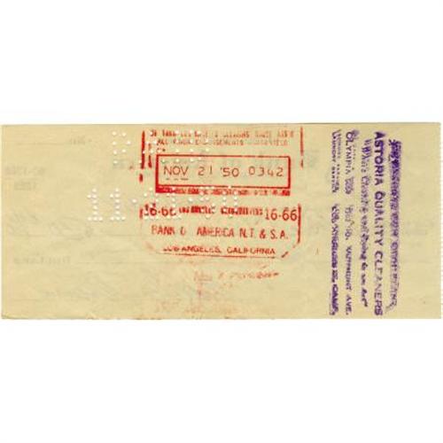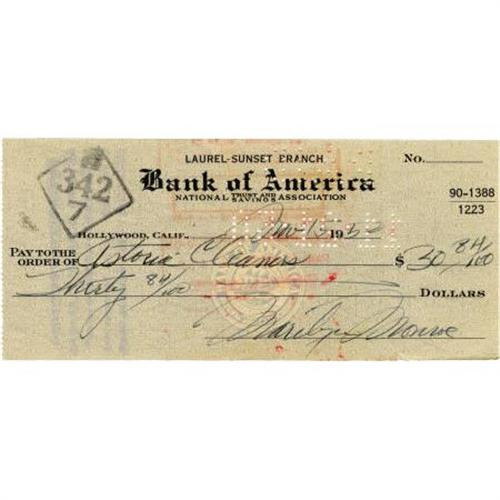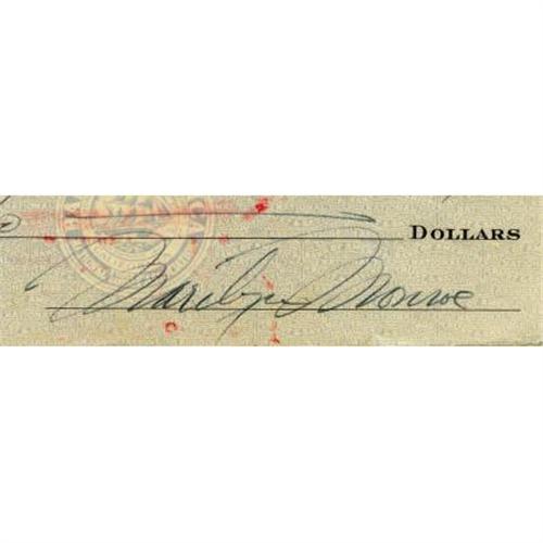 <B>Marilyn Monroe Signed Check.</B></I> A personal check for $30.84, dated November 15, 1950, and signed by Monroe in black ink. In Very Fine condition with mild wear, vertical fold impressions and the usual cancellation marks. <I>Accompanied by LOA from PSA/DNA.</B></I><BR><BR><b>Shipping:</b> Flat Material, Small (<a target="_blank" href="http://www.heritageauctions.com/common/shipping.php">view shipping information</a>)