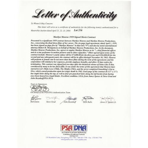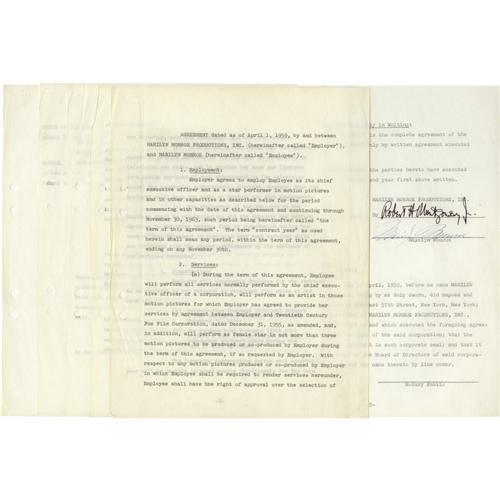 <B>Marilyn Monroe Signed Movie Contract (1959).</B></I> A very significant six-page contract between Marilyn Monroe and Marilyn Monroe Productions, dated April 1, 1959, and signed on page five by Monroe in blue ink, as well as by noted entertainment attorney Robert H. Montgomery. The contract agrees to employ Monroe as its chief financial officer and as a star performer, with a salary of $75,000 for the first year and $104,000 for each subsequent year. The contract was signed just two days after the release of <I>Some Like it Hot,</B></I> arguably Monroe's finest film, and it was under the terms of this agreement that she appeared in <I>Let's Make Love,</B></I> <I>The Misfits,</B></I> and the never-completed and aptly titled <I>Something's Got to Give.</B></I> (She was fired from said production for erratic attendance less than two months before her untimely death.) The document is in Very Fine to Excellent condition with mild tanning, staple holes to the upper left, and punch holes along the left edge from being housed in a legal binder. <I>Accompanied by a COA from PSA/DNA.</B></I><I>Accompanied by LOA from PSA/DNA.</B></I><BR><BR><b>Shipping:</b> Small Flat (<a target="_blank" href="http://www.heritageauctions.com/common/shipping.php">view shipping information</a>)
