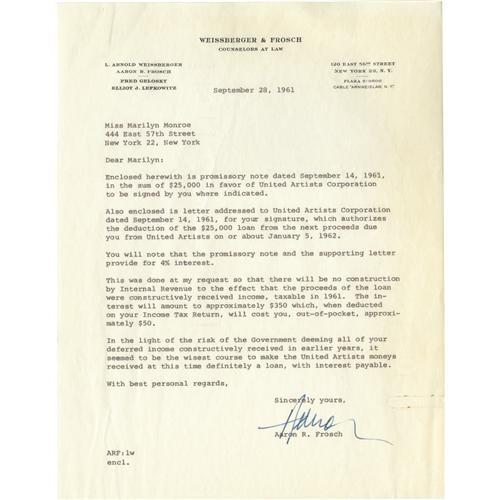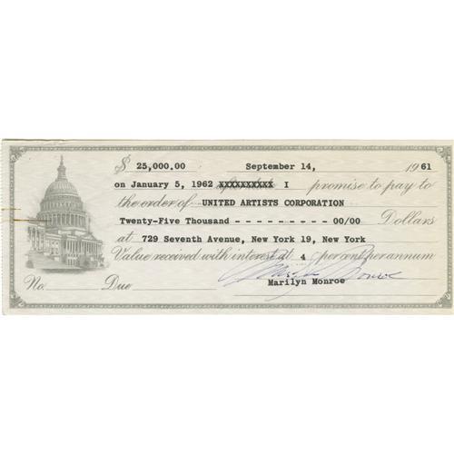 <B>Marilyn Monroe Signed Promissory Note.</B></I> A promissory note dated September 14, 1961, made out to United Artists Corporation for the sum of $25,000, signed by Monroe in blue ink. Also included is a letter to Monroe from attorney-to-the-stars Aaron R. Frosch that accompanied the note, dated September 28, 1961, and signed by him in blue ink. Both items are in Very Fine to Excellent condition with some mild tanning and rusty paperclip marks to each.<I>Accompanied by LOA from PSA/DNA.</B></I><BR><BR><b>Shipping:</b> Small Flat (<a target="_blank" href="http://www.heritageauctions.com/common/shipping.php">view shipping information</a>)