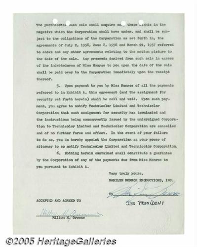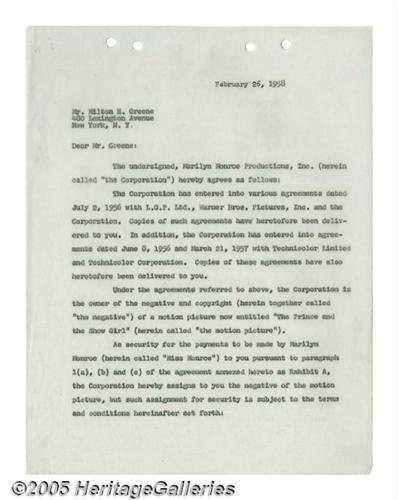<B>Marilyn Monroe Signed Document.</B></I> Three-page agreement dated February 26, 1958, between Marilyn Monroe Productions, Inc. and Milton Greene concerning the negative and copyrights "of a motion picture now entitled 'The Prince and the Showgirl,' " and assigns the negative to Warner Bros. as security for payments being made by Monroe's corporation. Nicely signed by Monroe on the last page. In fine condition, with two sets of binder holes to the top, staples in the upper left corner, and a light crease to the bottom of the second page. <I>Accompanied by a COA from PSA/DNA.</B></I> <I>With COA from PSA/DNA.</B></I>