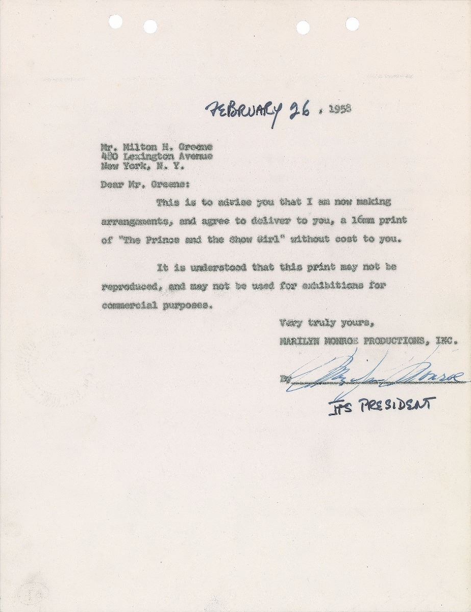 DS, one page, 8.5 x 11, February 26, 1958. An official letter to fashion photographer Milton H. Greene advising him “that I am now making arrangements, and agree to deliver to you, a 16mm print of ‘The Prince and the Showgirl’ without cost to you. It is understood that this print may not be reproduced, and may not be used for exhibitions for commercial purposes.” The document bears a “Marilyn Monroe Productions” blindstamp in the left margin. In fine condition.