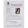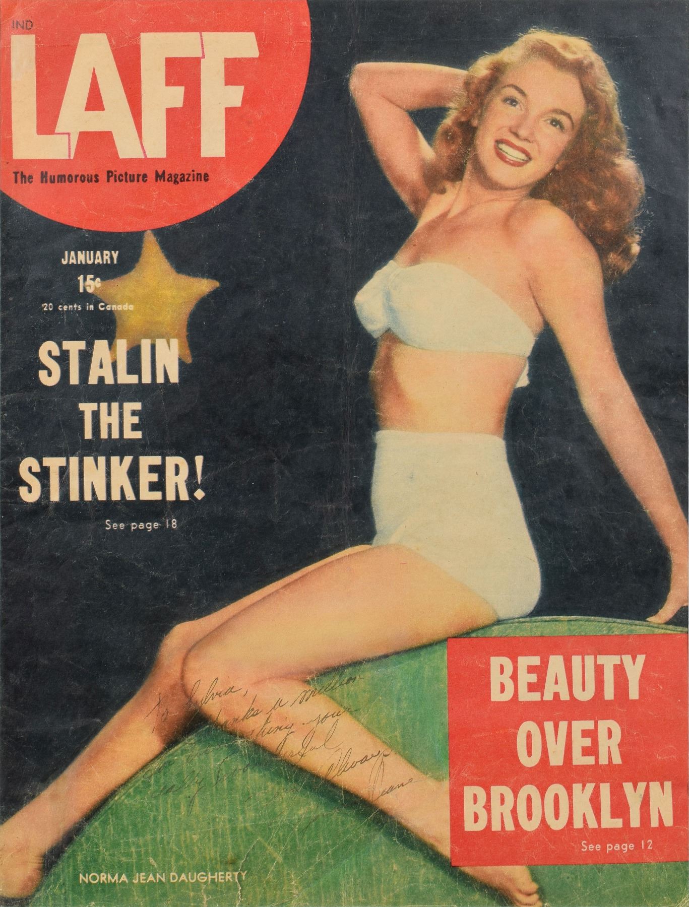 Rare original vintage Laff magazine from January 1947, measures 10 x 13, featuring a bikini-clad Norma Jeane Dougherty posing on the front cover, signed and inscribed in black, “To Sylvia, Thanks a million for everything. Your [sic] really wonderful. Love always, Norma Jeane.” Double-matted to an overall size of 14.75 x 17.75. In very good condition, with moderate contrast to portions of the signature and inscription, a light vertical fold running the length of the cover, light creasing and wrinkling passing through portions of signature and inscription, and a few small edge tears. Accompanied by a full letter of authenticity from Beckett. After completing her initial six-month contract with 20th Century Fox, Jeane signed on with the studio for an additional six months in February 1947. It was under this deal that the young actress, under the influence of studio executive Ben Lyon, adopted the now-iconic name ‘Marilyn Monroe.’ Taken by famed Hollywood photographer Bruno Bernard, this desirable cover rates as one of the earliest US magazine appearances by the young Norma Jeane.