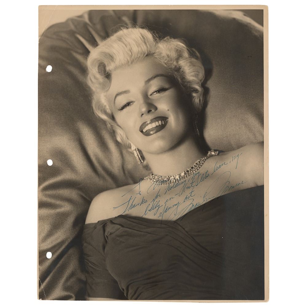 Vintage matte-finish 10.75 x 13.75 photo of Monroe reclining on a pillow and wearing a low-cut dress and diamond jewelry, a pose from circa 1953, signed and inscribed in blue ballpoint, "To Ann—Thanks for holding my belly in—But lets leave my fanny out, Marilyn Monroe.†In very good to fine condition, with trimmed edges, creasing to the upper and lower left corners, overall irregular silvering, and three file holes to the left edge, which could be matted out. An exquisite oversized portrait of Marilyn made all the more desirable by its wonderfully 'cheeky' inscription.