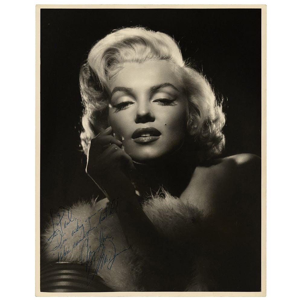 Vintage matte-finish 11 x 14 photo of Monroe taken during a Frank Powolny glamour shoot in 1953, signed and inscribed in bold blue ballpoint, "To Paul, I’m asking you—‘Where can you beat it!’ Marilyn Monroe.†In very good to fine condition, with scattered light creasing, and faint silvering to the darker areas of the image. Accompanied by a full letter of authenticity from PSA/DNA. Monroe and Powolny most famously teamed up in 1953 for a series of stunning, artfully framed publicity stills for the 1953 film Gentlemen Prefer Blondes. Immortalized for his classic World War II pinup of Betty Grable, Powolny remained a trusted photographer for Monroe throughout her career and is noted as taking the last known still photographs of the starlet during the production of Something's Got to Give, one week before her death in 1962. An uncommon oversized image of the iconic starlet.