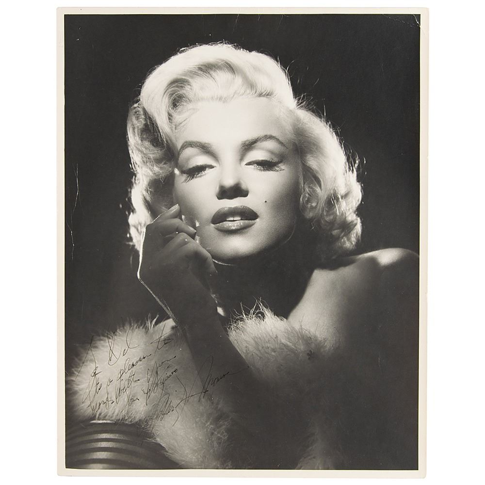 Vintage matte-finish 11 x 14 photo of Monroe taken during a Frank Powolny glamour shoot in 1953, signed and inscribed in fountain pen, “To Del, It’s a pleasure to work with you, love and kisses, Marilyn Monroe.” In very good to fine condition, with some creasing to the top edge and left edge, and poor-to-moderate signature contrast. Accompanied by a full letter of authenticity from PSA/DNA. Monroe and Powolny most famously teamed up in 1953 for a series of stunning, artfully framed publicity stills for the 1953 film Gentlemen Prefer Blondes. Immortalized for his classic World War II pinup of Betty Grable, Powolny remained a trusted photographer for Monroe throughout her career and is noted as taking the last known still photographs of the starlet during the production of Something's Got to Give, one week before her death in 1962. A mesmerizing oversized image of the iconic Hollywood beauty.