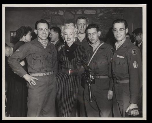 Marilyn Monroe 10'' x 8'' photograph signed ''Love and Kisses / Marilyn Monroe'', taken 16 February 1954, after she performed for the 7th Infantry Division in Korea. Monroe and Joe DiMaggio were newlyweds on a trip to Japan, when the bride took a detour to Korea to entertain the troops. She performed ten shows in four days, 16-19 February 1954, in front of audiences that totaled more than 100,000 soldiers. Identified on verso, in ink, by Corporal Joseph Fishman: ''L. to R. me! Marilyn Monroe. My Photo Officer Lt. Belche. Vic Congeloso & Julio Andajar. we were shooting Picture of her at the Generals Mess after a USO Show she put on for the troops Feb, 1954 -- over my Right Shoulder is Lefty O'Douls wife. of the N.Y. Yankees.'' Also includes a 8'' x 10'' copy of a photograph depicting Marilyn Monroe and Corporal Fishman, with camera in hand, which Fishman identified on verso as ''that's me working! Korea Feb 1954''. Photocopies of six 3.75'' x 5'' photographs also taken on 16 February 1954 are present, four of Marilyn Monroe alone (two performing in her purple cocktail gown), one with General Lionel Charles McGarr, and one with General McGarr and Mrs. Lefty O'Doul. In two of the photographs, Marilyn is wearing a special Army jacket with numerous patches, including one imprinted ''MONROE.'' Lot lastly includes an 8.5'' x 11'' reproduction of page 3 of the 18 February 1954 edition of the ''Los Angeles Times.'' In the upper right is a 2.5'' x 3.25'' photograph captioned ''Anything Goes''. Curvaceous Marilyn Monroe, wearing her famous purple cocktail gown, entertains 7th Division troops in Korea in show ''Anything Goes.'' Signed photo in near fine condition.