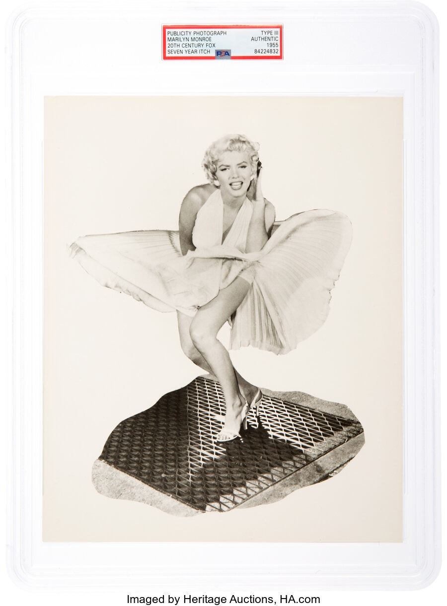 Marilyn MonroeThe Seven Year ItchPhoto.A gorgeous Marilyn Monroe photo from The Seven Year Itch, showing Marilyn in her white dress over the subway grate, from one of the most famous movie scenes of all time. Photo by Sam Shaw. Measures 8" x 10". Encased by PSA as Type III, a second generation photo circa 1955. Near Fine condition. LOA from PSA/DNA. COA from Heritage Auctions.
