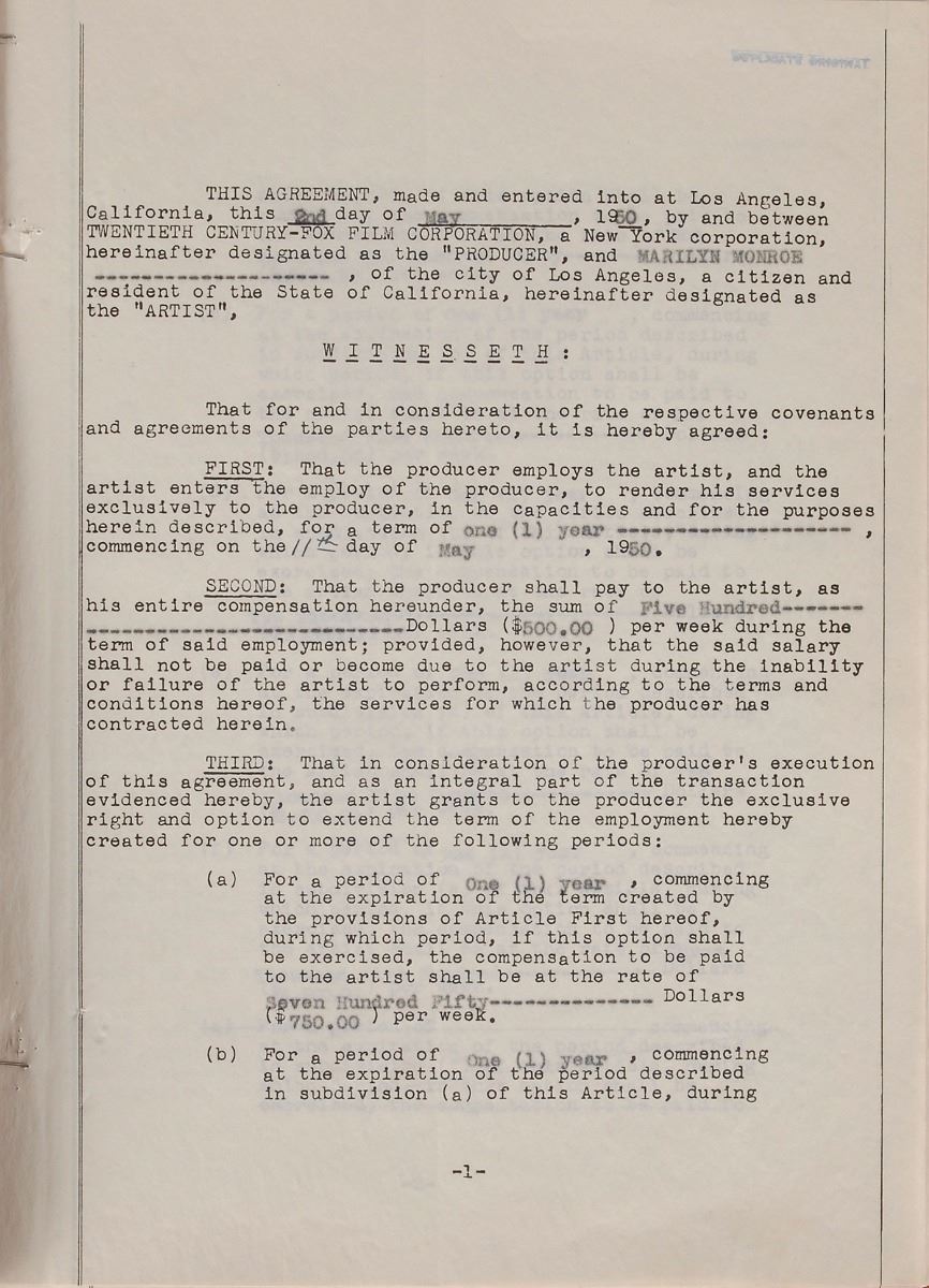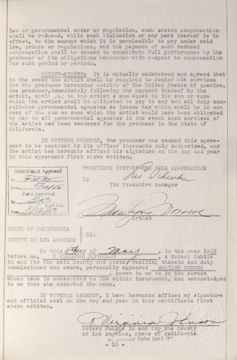 The year 1950 was a momentous one for Monroe, whose briefly impressive turns in John Huston’s The Asphalt Jungle and Joseph L. Mankiewicz’s All About Eve caught the eye of numerous film executives. The 1951 films Love Nest and As Young as You Feel cast Monroe in supporting roles, with the latter serving as her first assignment under the newly amended Twentieth Century-Fox contract. An intriguing document signed by the fast emerging starlet.