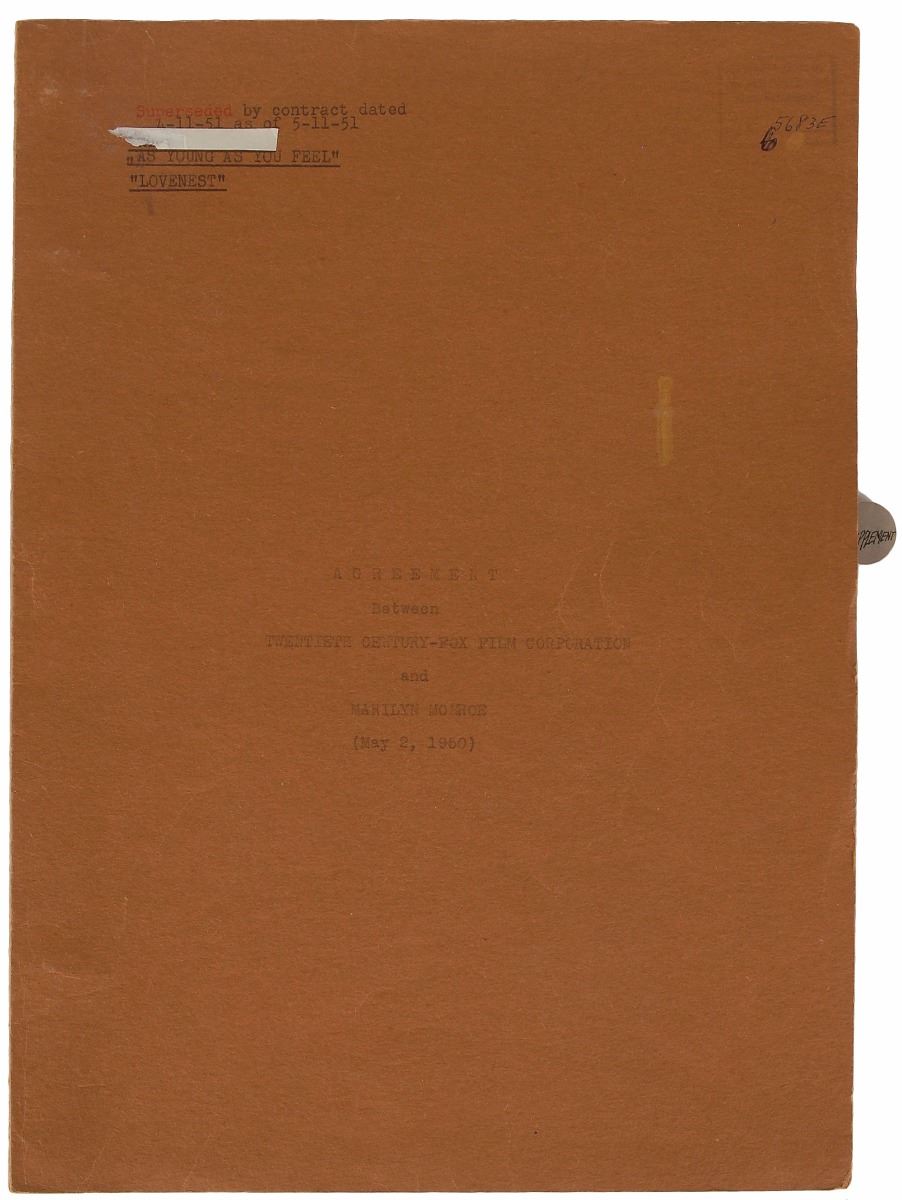 Twice-signed DS, sixteen pages, 8.75 x 11.5, May 12, 1950. Amended contract between Twentieth Century–Fox Film Corporation and Marilyn Monroe in which the latter agrees to render her services “for a term of one (1) year, commencing on the 11th day of May, 1950.” Signed at the conclusion in black ink by Monroe, who also signs at the conclusion of an attached supplementary letter confirming “mutual understanding and agreement relative to the amendment” of the original contract dated May 2, 1950. Housed and stapled within the folder for the original contract, listing two film titles in the upper left—As Young as You Feel and Love Nest. In fine condition.